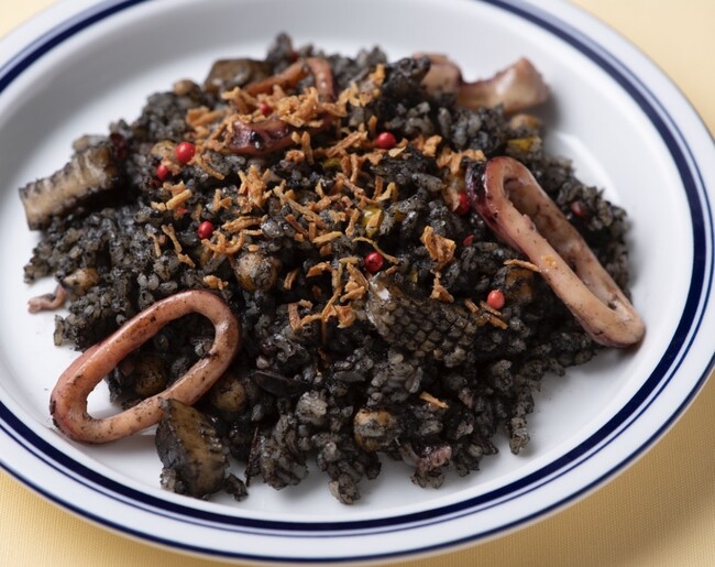 ロス・レイエス・マーゴス完全監修商品。野坂シェフが半年以上に渡ってこだわり抜いたレストランの味を限りなく再現しました。イカ墨の香り高いパエリヤに仕上げています。