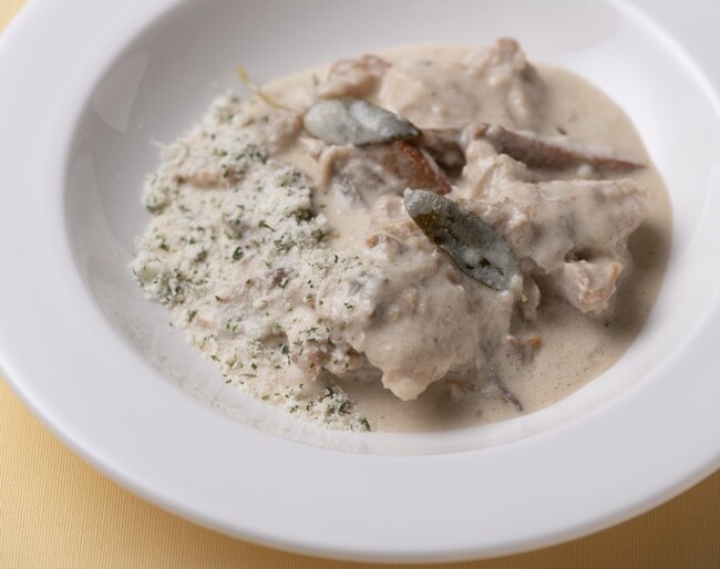 国産若鶏モモ、ジロール茸、舞茸をセージバターでソテーして、北海道産のマスカルポーネチーズとミルクで煮込むことで、香り高い、コクのある“クリームシチュー”に仕上げています。