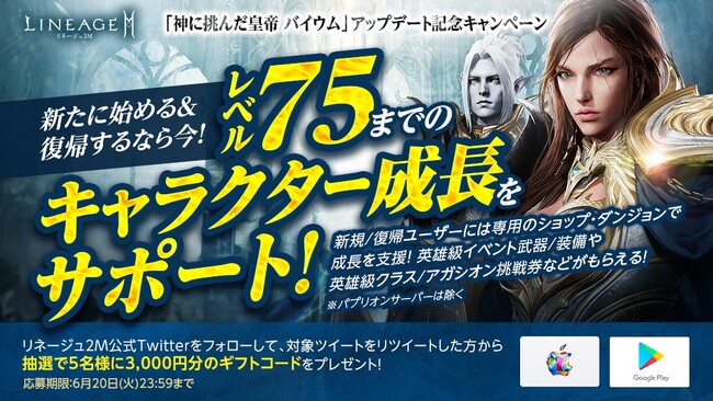 レベル75までのキャラクター成長サポート施策を記念して、抽選で5名様に3,000円分のギフトコードをプレゼントするフォロー&RTキャンペーンを実施します。
