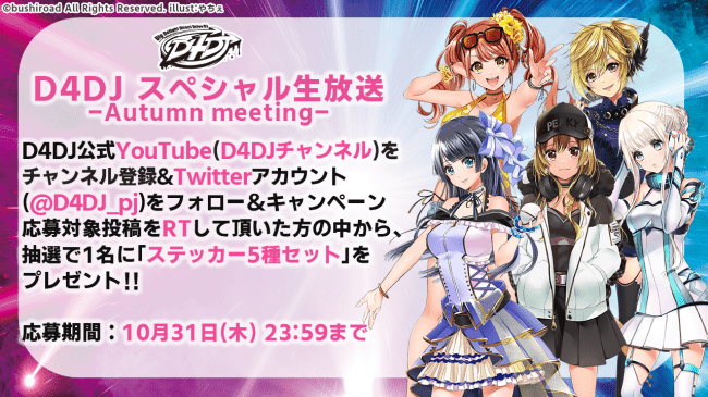 株式会社ブシロード(本社︓東京都中野区 代表取締役社長︓橋本義賢、以下、ブシロード)は、10月25日(金)より、「D4DJ スペシャル生放送 -Autumn meeting-」の放送を記念し、Twitterキャンペーンを開始いたしました。
