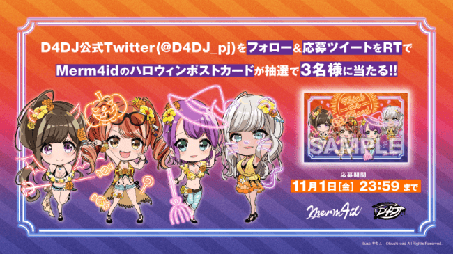 また、10月26日(土)より、Merm4idのハロウィンイラストポストカードが抽選で当たるプレゼントキャンペーンも、D4DJ公式Instagramと公式Twitterで開始いたしました。