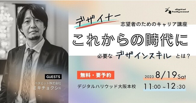 IT関連及びデジタルコンテンツの人材育成スクール[デジタルハリウッド] (運営会社:デジタルハリウッド株式会社、本社/本校:東京都千代田区、代表取締役社長兼CEO:吉村毅、学長:杉山知之)の大阪本校では、新コース『専科UIデザイナー専攻』の開講を記念し、関西を拠点に幅広く活躍されている、ペタビット株式会社の常務取締役ミキチョクシ氏にご登壇いただき、実際のデザインの現場や、デザイナー職としての展望、AIが進歩する中での共存等、これからのデザイナーに求められるスキルセットについてお話いただくイベントを開催します。