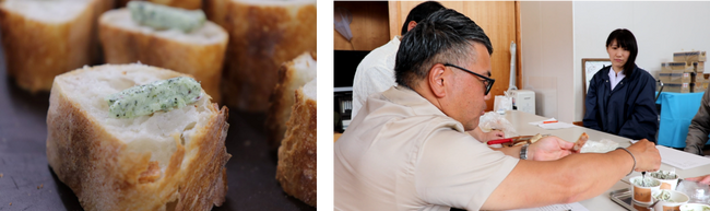 表敬訪問では、出席者が商品開発の経緯や込めた想いを報告。木村副知事に海藻バターそのままとパンに付けての2パターンで試食をしてもらいました。色味・香りに驚いた様子の木村副知事は、海藻バターを口にするとそのおいしさに驚いた様子で、『海藻の風味・塩味が活きている中で自然なバターの甘みを感じられて、すごくいいものができたと感じた。海と山のつながりはすごく大事で、それを言葉で伝えるだけでなく商品として落とし込んだことがとても有意義。おいしいだけでなくストーリー性もあって、売れる商品になっていくと思う。』と話しながらすぐに完食されました。