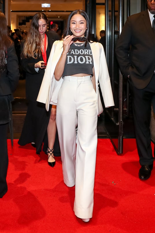 アンナ・サワイは、ホワイトウールとシルクのジャケットとパンツを纏い、2025年秋冬コレクションからグレーコットンのJ’ADORE DIOR Tシャツを合わせました。