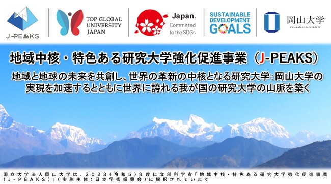 岡山大学 文部科学省「地域中核・特色ある研究大学強化促進事業(J-PEAKS)」に採択~地域と地球の未来を共創し、世界の革新の中核となる研究大学:岡山大学の実現を加速とともに世界に誇れる我が国の研究大学の山脈を築く~