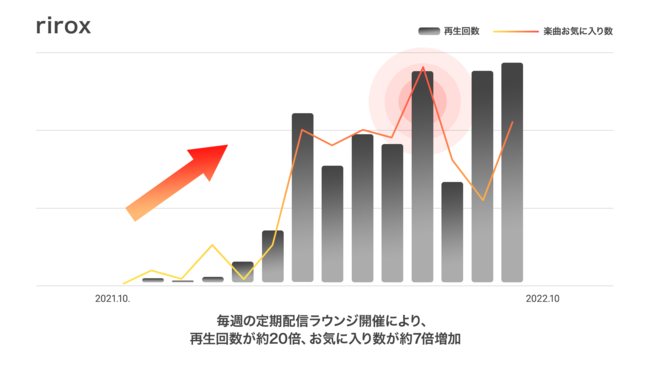 今回、アーティストの開催前と開催後の再生回数とアーティストのお気に入り数を調査した結果、ほとんどのアーティストで開催前の月と比べて再生回数、お気に入り数が上昇、また定期開催することで定常的に伸びている結果となりました。定期配信ラウンジを開催することにより、まだアーティストのことを知らないユーザーに、楽曲はもちろんのこと、メンバーの人間性、バンドの特徴など、多くの情報を知ってもらうことができ、新たなファンの獲得につながっています。