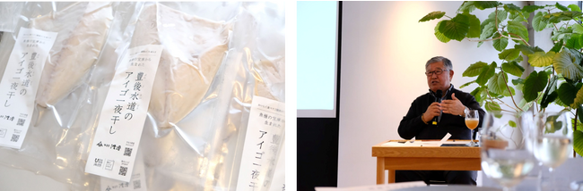 そして2022年、おいしく食べることで「磯焼け」を減少させ、豊かな海の未来につなげていくことを目的とした「豊後水道のアイゴの一夜干し」を共同開発。渡邉会長は値のつかない「アイゴ」を、水揚げされた全量買い取ることからスタートし、地元漁業者たちからの信頼を得るまで地道に取り組んだエピソードなど開発から現在までの歩みを語り、また「アイゴ」だけでなく海の温暖化が加速することで起こりえる問題を伝え、魚食文化を守るためにすでに取り組んでいるプロジェクトの数々を紹介。一つひとつでも私たち消費者ができることを伝え、参加者も熱心に耳を傾けました。