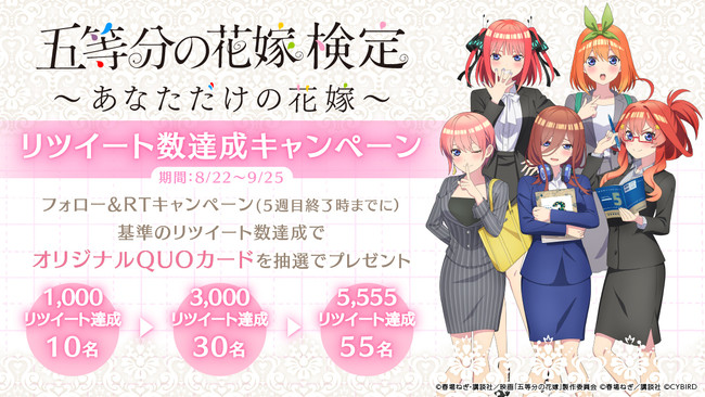 株式会社サイバード(本社:東京都渋谷区、代表取締役社長 兼 CEO 本島 匡、以下「サイバード」)は、「五等分の花嫁検定~あなただけの花嫁~」を、2022年8月26日(金)から11月4日(金)までの期間で実施します。