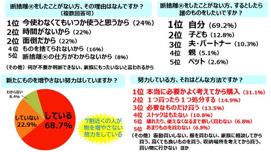 また、新たにものを増やさない努力をしている人は7割近くに。具体的には、買う前に本当に必要かよく考える、一つ買ったら一つ処分する、との回答が多く挙げられました。