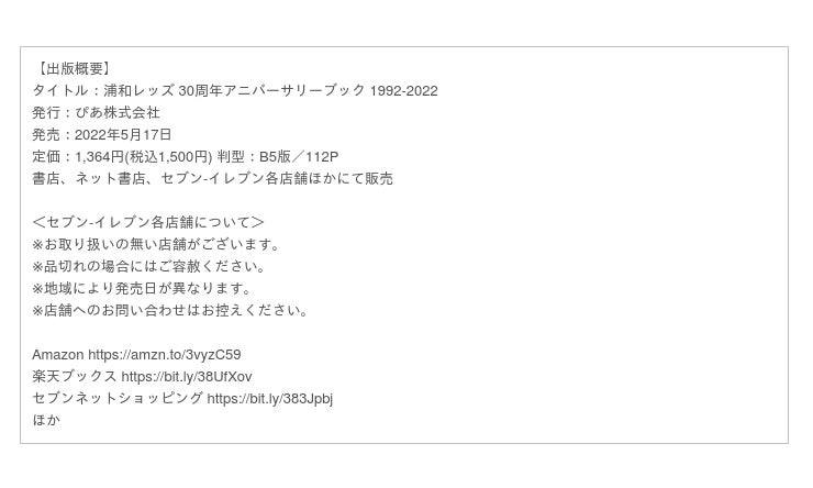 本日5月17日にぴあ株式会社より、『浦和レッズ 30周年アニバーサリーブック 1992-2022』が発売となりました。