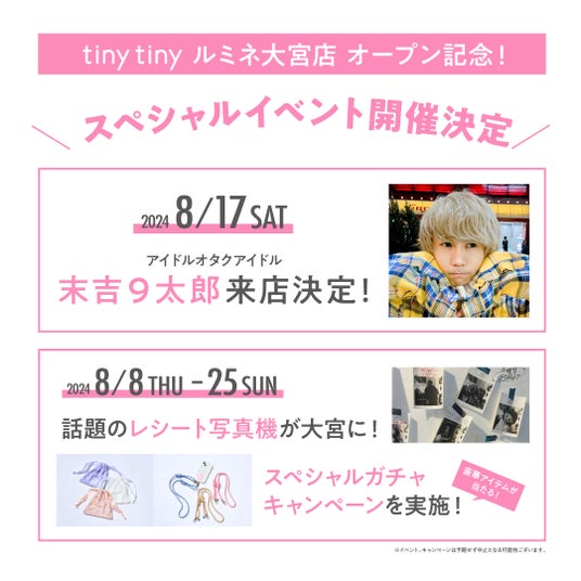 オープンを記念して、韓国で話題の「レシート写真機」の体験や、豪華ノベルティが必ず当たるスペシャルガチャを期間限定でご用意します。また、「tiny tiny」の新ビジュアルにも登場する歌手・女優鈴木愛理さんのメッセージムービーを大宮店限定で期間限定放映します。