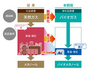 従来の工業的な合成法で使用される一般的な原料である天然ガスなどの化石資源ではなく、バイオガスに含まれるメタンガスを用いることで、原料の脱炭素化を図ります。あわせて、常温・常圧の条件下での安定的な合成を実現することで、投入エネルギーの削減が可能となり、合成時の省エネ化も実現しました。