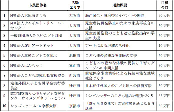クラウドファンディングの対象となる市民団体は、阪急阪神沿線で“地域環境づくり”や“次世代の育成”に取り組む「阪急阪神 未来のゆめ・まち基金」の助成団体のうちの10団体で、目標金額は1団体あたり最大50万円としています。同基金の助成団体に、クラウドファンディングの機会を提供することで、継続的な寄付のきっかけとなり、市民団体が将来にわたり活動を維持できるようにすることを目的としています。
