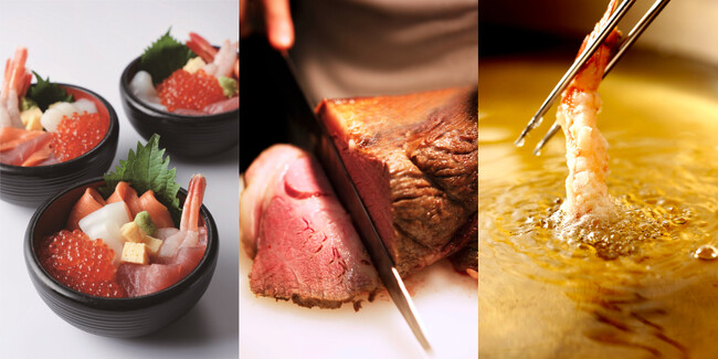 低温で時間をかけてじっくりジューシーに焼き上げるホテル伝統のローストビーフや天麩羅、ご注文をいただいてから作る出来立ての“江戸甘味噌香るボロネーゼスパゲティ”に加え、いくらやマグロなど、お好みの海鮮がのせ放題のオリジナル海鮮丼に、揚げたてソースかつ丼・天丼など、ライブ感あふれるシェフのクッキングサービスで出来立てを提供するほか、ニューオータニ自慢のメニューの数々をご用意いたします。