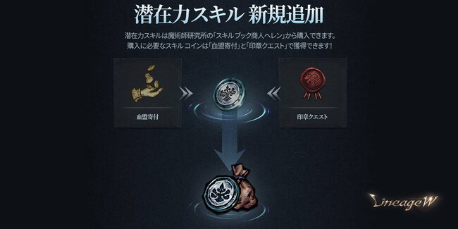 「潜在力スキル」はグルーディオ領地の魔術師研究所にいる「スキル ブック商人 ヘレン」から「スキル コイン」を引き換えに獲得することができます。「スキル コイン」は血盟寄付や印章クエストで獲得することが可能です。