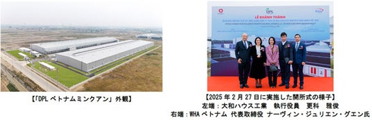 大和ハウス工業株式会社(本社:大阪市、社長:芳井敬一)は、ベトナム社会主義共和国(以下「ベトナム」)北部フンイエン省において、2024年3月1日より、マルチテナント型物流施設(※1)「DPL Vietnam Minh Quang」(平屋建て、敷地面積70,109.20平方メートル 、延床面積38,871.99平方メートル )を開発してきましたが、2024年12月26日に竣工し、2025年2月27日に開所式を行いました。