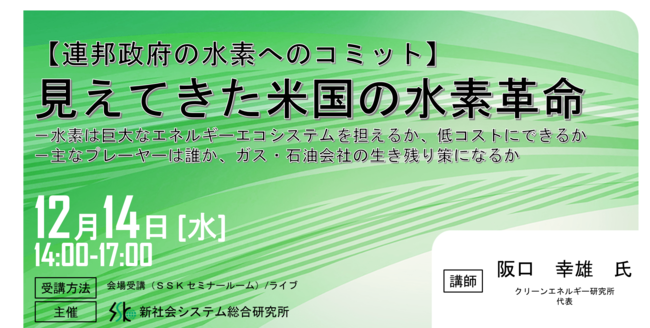 米国(シリコンバレー)に37年以上居住し、これらの流れをつぶさに見てきた講師が「見えてきた米国の水素革命」という最新のトピックスをお送りする。