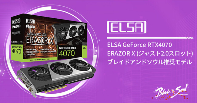 PC向けオンラインゲーム『ブレイドアンドソウル(以下ブレソ)』をサービスしているエヌ・シー・ジャパン株式会社(本社:東京都港区、代表取締役:金 澤憲(キム テクホン)以下、エヌシージャパン)は、2023年6月28日(水)に、「ELSA GeForce RTX4070 ERAZOR X(ジャスト2.0スロット)」ブレイドアンドソウル推奨モデル発売を記念したコラボキャンペーンを開催する事をお知らせします。