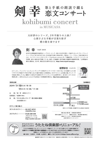 『剣幸 kohibumi concert in MUSICASA』が2024年1月10日 (水) ~2024年1月11日 (木)に代々木上原ムジカーザ(東京都渋谷区西原3-33-1)にて上演されます。