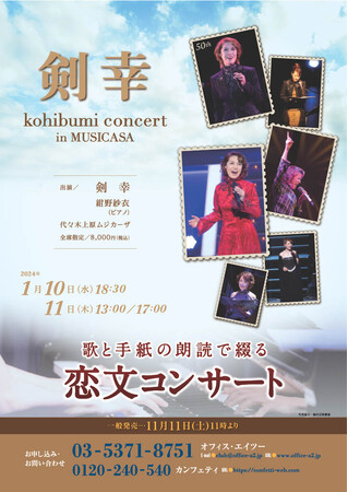 2024年に舞台生活50年を迎える剣幸が贈る、歌と朗読のコラボレーション。熱い想いのこもった手紙の朗読と、その内容にイメージされる曲をカップリングしてお届けする好評のシリーズ、久しぶりの上演です。代々木上原のムジカーザは音の響きも素晴らしく、紺野紗衣が奏でるピアノの音色は絶品! 瀟洒なサロンで味わう、涙と笑いにつつまれる贅沢なひととき。あたたかい空気に溢れた剣幸恋文コンサートをぜひ体感してください!