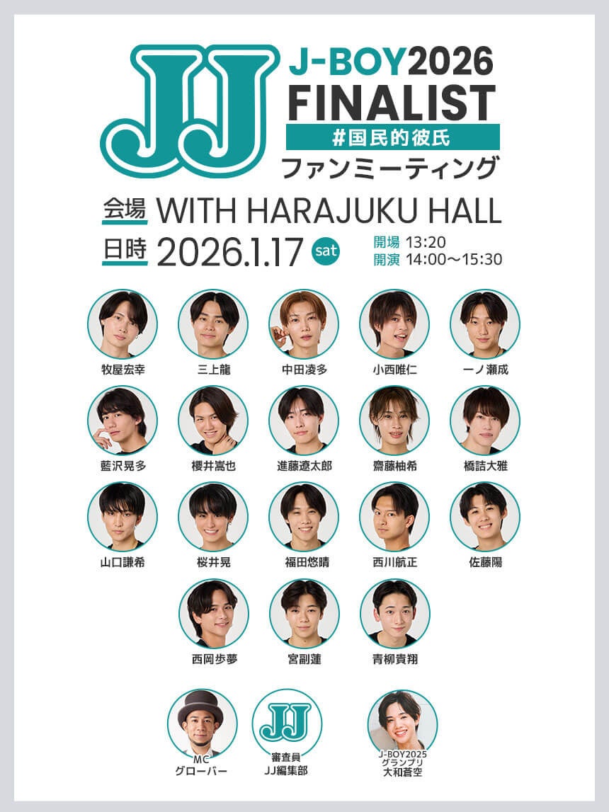 注目のファイナル審査は2026年1月9日(金)から「RankingMaster」でのWEB投票部門がスタート。また、1月17日(土)には、ファイナリストがファンの前にお目見えする「J-BOY2026 FINALIST #国民的彼氏 ファンミーティング」が開催されます。