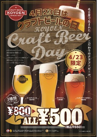 サッポロホールディングスのグループ企業である株式会社サッポロライオン(本社・東京都中央区、社長・三宅祐一郎)は、愛知県名古屋市で展開する「CRAFT BEER KOYOEN(クラフトヒ゛ヤ コウヨウエン)」にて、「クラフトビールの日」を記念したイベントを4月23日(日)限定で実施します。