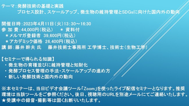 先端技術情報や市場情報を提供している(株)シーエムシー・リサーチ(千代田区神田錦町: https://cmcre.com/ )では、 各種材料・化学品などの市場動向・技術動向のセミナーや書籍発行を行っておりますが、 このたび「発酵技術の基礎と実践 プロセス設計、スケールアップ、微生物の維持管理とSDGsに向けた国内外の動向」と題するセミナーを、 講師に藤井 幹夫 氏 (藤井技術士事務所 工学博士、技術士(生物工学))をお迎えし、2023年4月11日(火)13:30より、 ZOOMを利用したライブ配信で開催いたします。 受講料は、 一般:44,000円(税込)、 弊社メルマガ会員:39,600円(税込)、 アカデミック価格は26,400円(税込)となっております(資料付)。