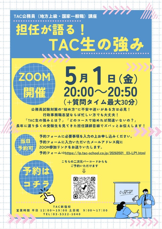 資格取得に向けた教育サービスを展開しているTAC株式会社(東京都千代田区)では、公務員試験を検討されている方へ向けて「担任が語る!TAC生の強み」を、2026年5月1日(金)にTAC新宿校からオンラインで配信します。