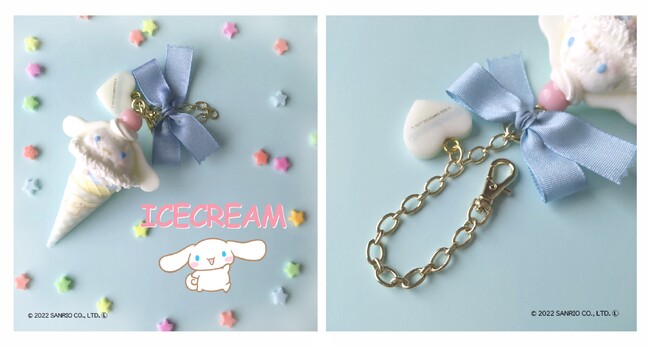 シナモロールのお顔をモチーフにした、ひとつひとつ丁寧に手作業にてつくられる、ひんやりアイスクリームのバッグチャームです。ワンポイントとしてバッグなどにアクセサリーとしておすすめのアイテム。