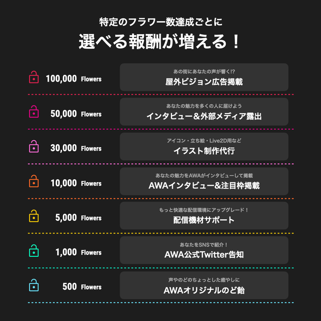 例:5,000フラワーを達成した場合、「配信機材サポート」「AWA公式Twitter告知」「AWAオリジナルのど飴」の中から、選択した報酬を受け取れます。