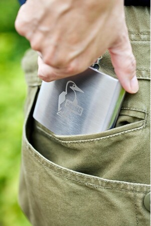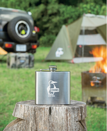表面に今年40周年を迎えるチャムスのロゴを配しました。お気に入りのウイスキーを入れて、キャンプや旅のお供に!