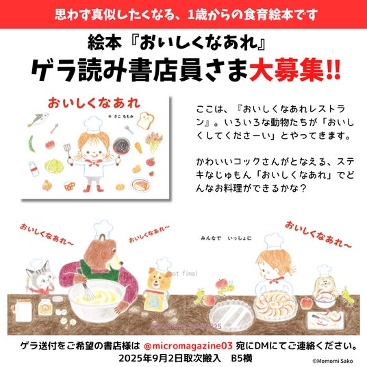 マイクロマガジン社(東京都中央区)は、2025年9月刊行予定の新作絵本『おいしくなあれ』のゲラ(校了前の原稿)を読んでくださる書店員さまを募集いたします。