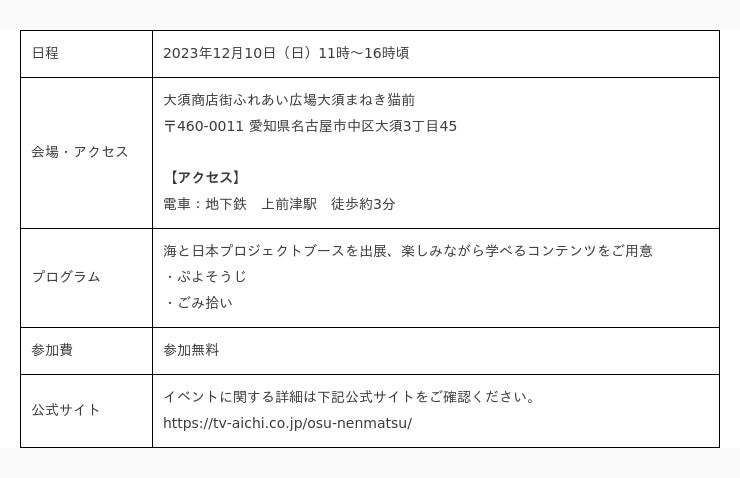 一般社団法人海と日本プロジェクト in 愛知県は、昨年に引き続き2023年12月10日(日)に大須商店街で開催される「大須商店街×テレビ愛知 感謝祭2023」において、ぷよそうじと清掃活動を実施します。