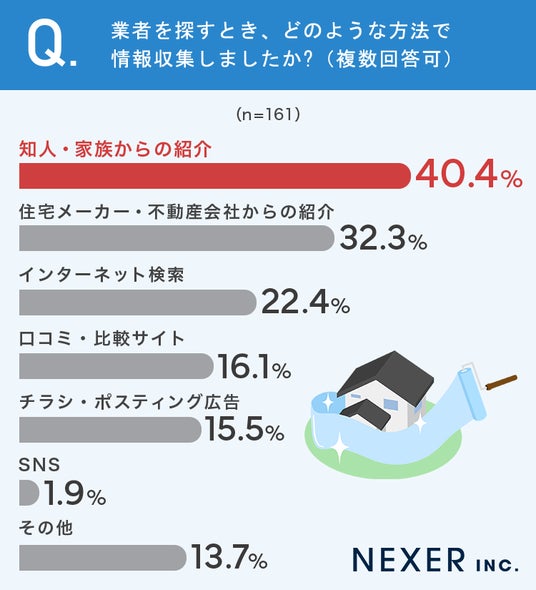 最も多かったのは「知人・家族からの紹介」で40.4%でした。次いで「住宅メーカー・不動産会社からの紹介」が32.3%、「インターネット検索」が22.4%、「口コミ・比較サイト」が16.1%という結果です。