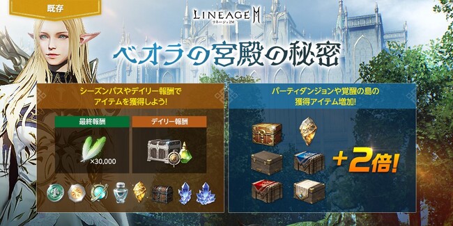 期間中、毎日達成していくデイリー ミッションと2週間でクリアを目指すシーズン ミッションで構成された、新規シーズンパス「ベオラの宮殿のシーズンパス」が登場します。デイリー ミッション、シーズン ミッションをそれぞれ達成してシーズンパスEXPを獲得し、パス レベルを上昇させることで、「祝福された魔力強化石(イベント)」や「中級覚醒のポーション(刻印)」など様々なアイテムを報酬として獲得することができます。また、1,000,000アデナを使用することでプレミアム報酬を有効化することができます。最終報酬として、「アインハザードの祝福」50,000を獲得することが可能です。