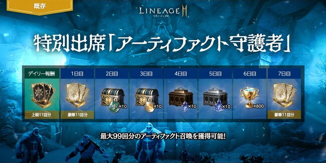 2,000ダイヤでオープンすることができ最大7回報酬を獲得できる特別出席「アーティファクト守護者」が登場しました。