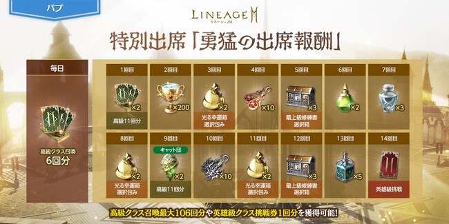 毎回もらえる「勇猛の高級クラス獲得券(6回)(刻印)」1個のほか、「勇猛の高級クラス獲得券(11回)(刻印)」2個や「勇猛の高級キャット団集魂石(11回)(刻印)2個、「勇猛の英雄級クラス挑戦券(1回)(刻印)」などのアイテムを受け取ることができます。
