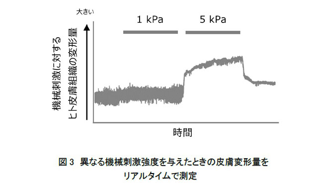 メルケル細胞は、皮膚が触れられることで生じる皮膚のわずかな変形(機械刺激)を感じて、脳へ触れられた情報を伝えているといわれています。しかし、実際に生きているヒトの皮膚内で働くメルケル細胞の機能に関する詳細はこれまで明らかにされていませんでした。そこで、生体内に近い状態で皮膚に機械刺激が与えられたときのメルケル細胞の反応を調べるため、東北大学大学院情報科学研究科・昆陽雅司准教授との共同研究により、顕微鏡に搭載できる機械刺激提示デバイスを開発しました。これにより、皮膚に機械刺激を与えながら顕微鏡で細胞の反応をリアルタイムに観察するという非常に難易度の高い実験系の構築に成功しました。皮膚変形量が小さな機械刺激(1kPa)では確認できなかったメルケル細胞の反応が、皮膚変形量が大きかった機械刺激(5kPa)に対しては確認でき、生体内に近い状態で、メルケル細胞が皮膚を通して機械刺激を感じ取り反応している様子をリアルタイムで評価することに成功しました(図3,4)。