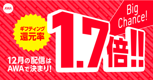 12月1日(木)~12月31日(土)の期間内にAWAラウンジを開催していただいた配信者全員のギフティング還元率が通常の1.7倍になります。なお、期間内に初めて配信をされた方も本企画の対象となりますので、まだAWAで音声ライブ配信を行ったことのない配信者の方のご参加もお待ちしています。