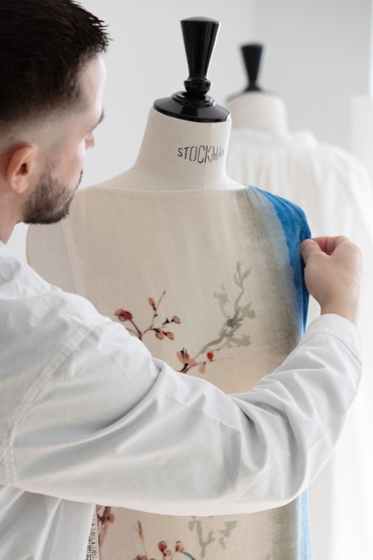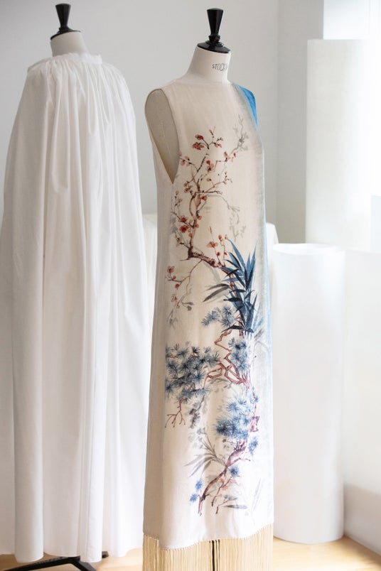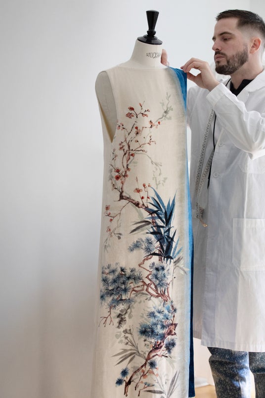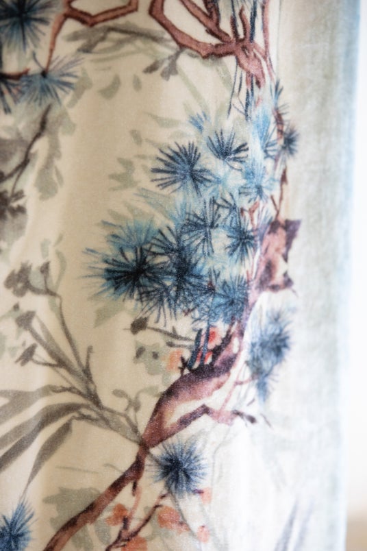 ジョディ・フォスターは、ブルーのプリントをあしらったベルベットのオフホワイトドレスを着用しました。このドレスの制作には74時間が費やされ、完成に導かれました。