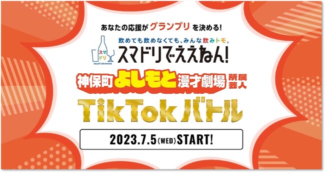 飲み方の多様性を推進するアサヒビールの「スマートドリンキング」は更なる認知拡大に向け、よしもと芸人とコラボレーションした『We are 飲みトモ スマドリでええねん! PROJECT』を実施しております。その取り組みの一環として、ショートムービープラットフォーム「TikTok(ティックトック)」にて、7月5日(水)から18日(火)の期間、吉本興業が運営する神保町よしもと漫才劇場所属の芸人9組によるパフォーマンス人気投票バトル「スマドリでええねん!神保町よしもと漫才劇場所属芸人TikTokバトル」を開催いたします。また、本企画宣伝担当の芸人4組のパフォーマンス動画を先行して公開しています。
