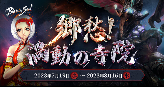 PC向けオンラインゲーム『ブレイドアンドソウル(以下ブレソ)』をサービスしているエヌ・シー・ジャパン株式会社(本社:東京都港区、代表取締役:金 澤憲(キム テクホン)以下、エヌシージャパン)は、2023年7月19日(水)に、夏イベント「流浪団ゲーム 一対の架け橋」の開催、期間限定超強化「郷愁!渦動の寺院」の開催、及び新作水着「猛暑」を含む新衣装の登場をお知らせします。