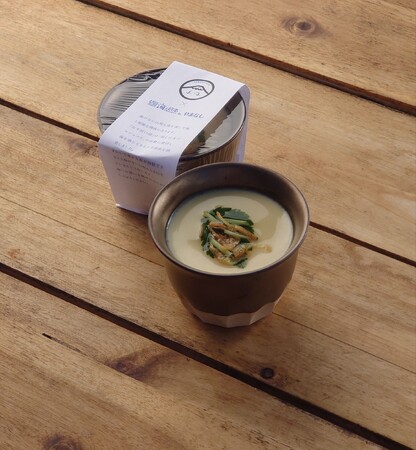 新商品は「金の茶碗蒸し」で、ホタテの出汁の効いた卵液に香りと食感のよい桜えびをトッピングしたものです。茶碗蒸しの器は金色に塗られた益子焼で食べ終わった後にお土産としてお持ち帰りできるようになっています。