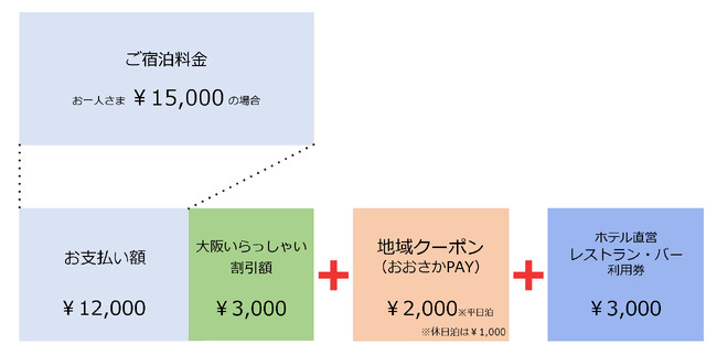 当プランでは、「おおさかPAY」クーポンを最大¥2,000、ホテル直営レストラン・バーで利用可能な「ミールクーポン」を¥3,000、合計最大¥5,000のクーポンを付与いたします。