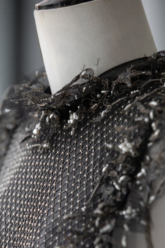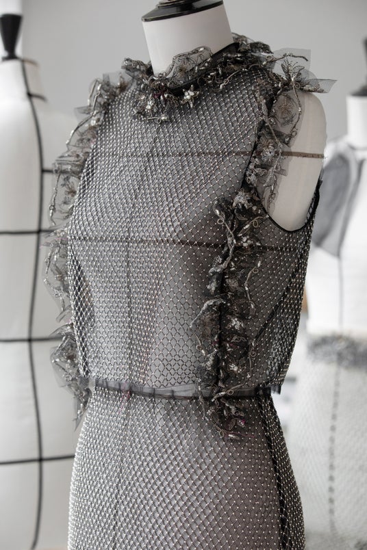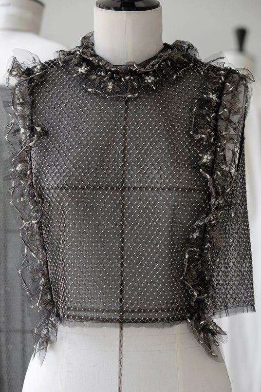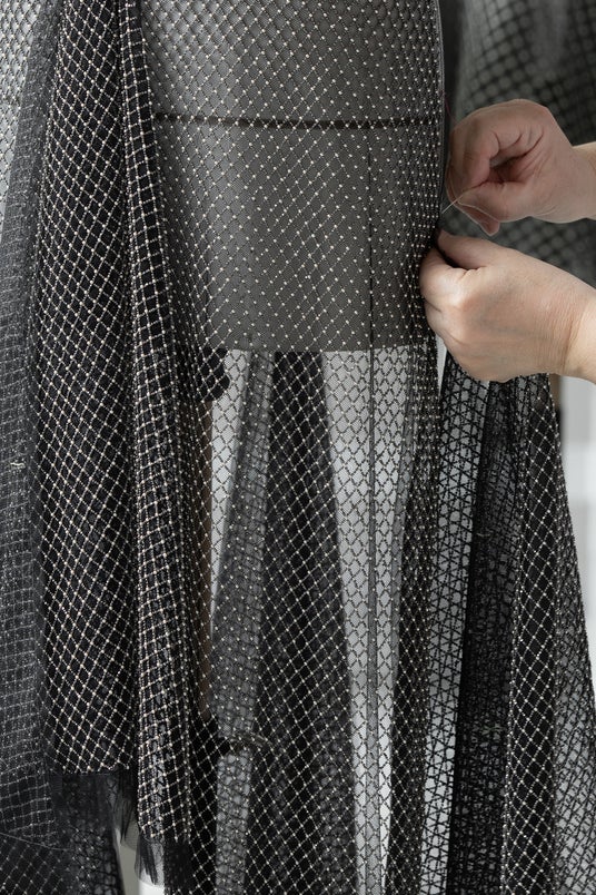 サラ・ジロドーは、刺繍をあしらったブラックのチュールドレスを纏いました。このドレスの刺繍には2500時間が費やされ、アトリエの職人たちによって完成に導かれました。メイクアップはディオール ビューティです。