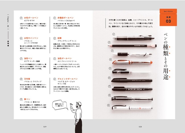 さらには、近所の本屋さんや文房具店で手軽に手に入る「書きたい文字」別のおすすめペンも多数収録されているので、美文字習得欲を逃しません。