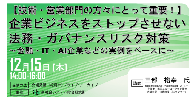 ビジネスセミナーを企画開催する新社会システム総合研究所(SSK)は、下記セミナーを開催します。