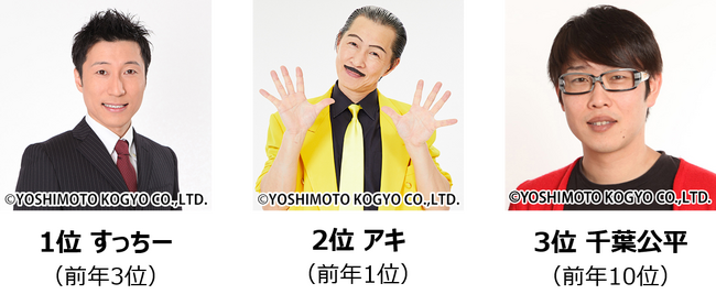 1位は現座長、「すち子」で不動の人気を誇る“すっちー”、2位は昨年の総選挙で3万9405票を獲得し1位に輝いた“アキ”、3位には女性座員からも大人気、今や新喜劇の舞台では欠かせない存在、“千葉公平”。