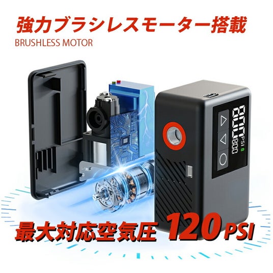 強力なブラレスモーター搭載で、最大対応空気圧は120PSI(約827kpa)。