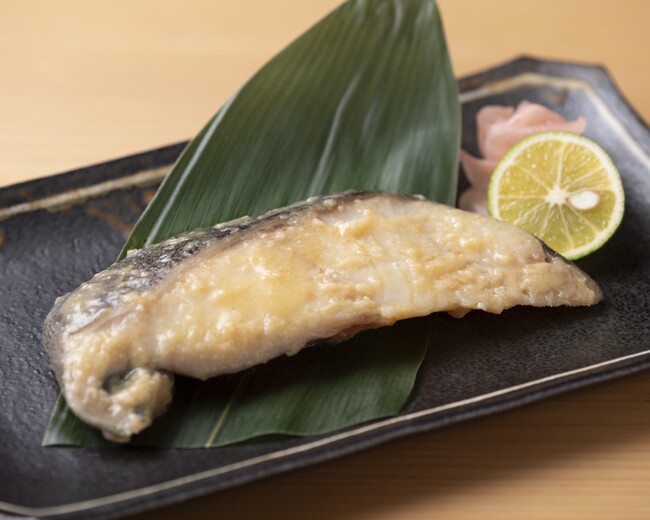 脂の乗ったカラスカレイを江戸甘味噌にじっくりと漬け込み、香ばしく炙り焼きにしました。味噌は東京中野の老舗、あぶまた味噌を使用。とろりとした独特の甘みがあります。